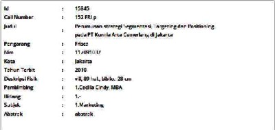 Frisca, Frisca (2010) Perumusan strategi Segmentasi, Targeting dan Positioning pada PT Kurnia Arta Cemerlang di Jakarta. Masters thesis, Universitas Tarumanagara.