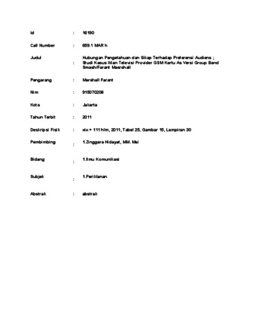 Farant, Marshall (2011) Hubungan Pengetahuan dan Sikap Terhadap Preferensi Audiens ; Studi Kasus Iklan Televisi Provider GSM Kartu As Versi Group Band Smash/Farant Masrshall. Skripsi thesis, UNIVERSITAS TARUMANAGARA.