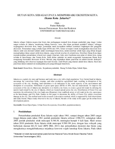 Rahardjo, Parino (2011) HUTAN KOTA SEBAGAI UPAYA MEMPERBAIKI EKOSITEM KOTA (Kasus Kota Jakarta). Seminar Nasional Temu Ilmiah Dosen Fakultas Teknik Universitas Tarumanagara. (In Press)