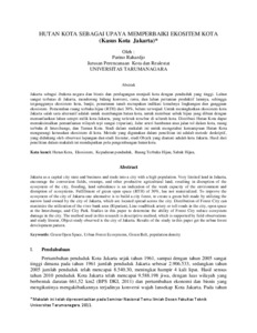 Jakarta as a capital city state and business and trade into a city with a high population. Very limited land in Jakarta, encourage the conversion fields, swamps, and other productive agricultural land, resulting in disruption of the ecosystem of the city, flooding, land subsidence is an indication of the weak capacity of the environment and disruption of ecosystems. Fulfillment of green open space (RTH) of 30%, has not materialized. To improve the ecosystem of the city of Jakarta one alternative is to build a city forest, to create a green belt made by utilizing the narrow land owned by the city of Jakarta, which are located spread across the city. Distribution of Forest City can maximize the utilization of the river bank area (Riparian), Line roadblock artery or toll roads in the city, open space at the Interchange, and City Park. Studies in this paper to determine the ability of Forest City reduce ecosystem damage in the city. The method used in this research is descriptive method, which is supported by field observations and study litratur, Object study observed is the city of Jakarta. Results of the study in this paper get the urban forest development pattern.