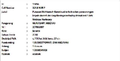 Nuriasary, Meizayu (2010) Putusan Mahkamah Konstitusi terkait calon perseorangan kepala daerah dan impilkasinya terhadap demokrasi. Masters thesis, Universitas Tarumanagara.