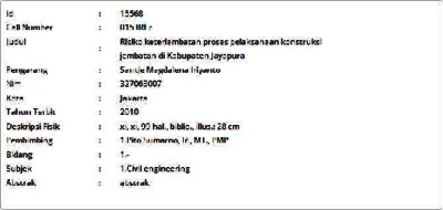 Iriyanto, Santje Magdalena (2010) Risiko keterlambatan proses pelaksanaan konstruksi jembatan di Kabupaten Jayapura. Masters thesis, Universitas Tarumanagara.