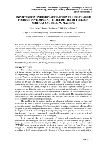 Halim, Agus and Septiawan, JEMMY and Widya Utama, Didi (2013) EXPERT SYSTEM IN DESIGN AUTOMATION FOR CUSTOMIZED PRODUCT DEVELOPMENT - THREE DEGREE OF FREEDOM VERTICAL CNC MILLING MACHINE. In: International Conference on Engineering of Tarumanagara (ICET 2013), 02-03 Oktober 2013, Jakarta-Indonesia.