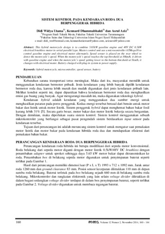 Widya Utama, Didi and Dhammabakti, Kennard and Aziz, Asrul (2014) SISTEM KONTROL PADA KENDARAAN RODA DUA BERPENGGERAK HIBRIDA. Jurnal Ilmiah Teknik Mesin Poros, 12 (2). pp. 160-164. ISSN 2442 - 4501