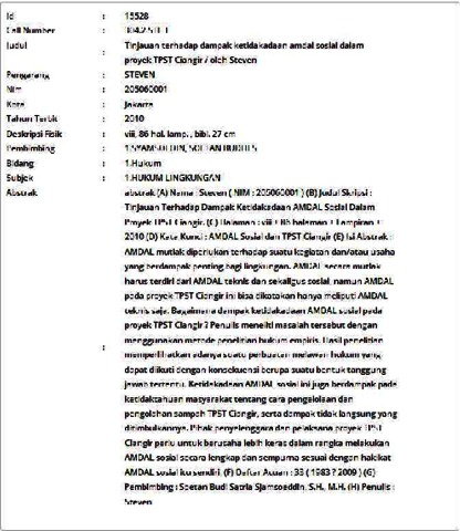 (A) Nama : Steven ( NIM : 205060001 ) (B) Judul Skripsi : Tinjauan Terhadap Dampak Ketidakadaan AMDAL Sosial Dalam Proyek TPST Ciangir. (C) Halaman : viii + 86 halaman + Lampiran + 2010 (D) Kata Kunci : AMDAL Sosial dan TPST Ciangir (E) Isi Abstrak : AMDAL mutlak diperlukan terhadap suatu kegiatan dan/atau usaha yang berdampak penting bagi lingkungan. AMDAL secara mutlak harus terdiri dari AMDAL teknis dan sekaligus sosial, namun AMDAL pada proyek TPST Ciangir ini bisa dikatakan hanya meliputi AMDAL teknis saja. Bagaimana dampak ketidakadaan AMDAL sosial pada proyek TPST Ciangir ? Penulis meneliti masalah tersebut dengan menggunakan metode penelitian hukum empiris. Hasil penelitian memperlihatkan adanya suatu perbuatan melawan hukum yang dapat diikuti dengan konsekuensi berupa suatu bentuk tanggung jawab tertentu. Ketidakadaan AMDAL sosial ini juga berdampak pada ketidaktahuan masyarakat tentang cara pengelolaan dan pengolahan sampah TPST Ciangir, serta dampak tidak langsung yang ditimbulkannya. Pihak penyelenggara dan pelaksana proyek TPST Ciangir perlu untuk berusaha lebih keras dalam rangka melakukan AMDAL sosial secara lengkap dan sempurna sesuai dengan hakikat AMDAL sosial itu sendiri. (F) Daftar Acuan : 33 ( 1983 ? 2009 ) (G) Pembimbing : Soetan Budi Satria Sjamsoeddin, S.H., M.H. (H) Penulis : Steven