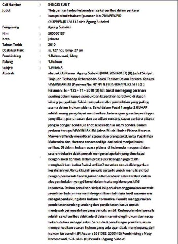 (A) Nama : Agung Subakti (NIM: 205060137) (B) Judul Skripsi : Tinjauan Terhadap Keberadaan. Saksi Terlibat Dalam Perkara Korupsi SISMINBAKUM (Putusan No: 701/PEN.PID/2009/PN.JKT.SEL) (C) Halaman : ix + 125 + 11 + 2010 (D) Isi : Saksi memegang peranan penting dalam upaya pembuktian kesalahan terdakwa di depan sidang pengadilan. Saksi merupakan alat pembuktian yang paling utama dalam hukum pidana. Saksi dalam Pasal 1 angka 2 KUHAP adalah orang yang dapat memberikan keterangan guna kepentingan penyidikan, penuntutan dan peradilan tentang suatu perkara pidana yang ia dengar sendiri, ia lihat sendiri dan ia alami sendiri. Dalam perkara korupsi SISMINBAKUM, Jaksa Muda Tindak Pidana Khusus, Marwan Effendy menaikkan status dua orang saksi, yaitu Yusril Ihza Mahendra dan Hartono tanoesoedibjo dari saksi menjadi saksi terlibat. Di dalam hukum acara pidana di Indonesia maupun dalam tataran doktrin tidak pernah mengenal apakah yang dimaksud dengan saksi terlibat. Dalam proses persidangan juga telah menghadirkan kedua ?saksi terlibat? tersebut untuk didengarkan kesaksiannya. Untuk itulah penulis tertarik untuk menulis skripsi dengan permasalahan Bagaimana Keberadaan saksi terlibat dalam alat pembuktian yang dikenal dalam hukum pidana positif di Indonesia. Dalam penulisan skripsi ini penulis menggunakan metode penelitian hukum normatif dengan ditambah data hasil wawancara sebagai pendukung data hukum normative. Penulis menggunakan pendekatan undang-undang dan pendekatan kasus untuk menjawab permasalahan yang penulis ambil. Kesimpulan dari penulis adalah saksi terlibat tidak ada di dalam terminologi hukum dan tetap bekedudukan sebagai saksi. Saran dari penulis agar praktis hukum memperhatikan aturan hukum yang ada agar tidak menyimpang dari hukum itu sendiri. (F) Acuan : 26 (1982-2009) (G) Pembimbing : Mety Rachmawati, S.H., M.H. (H) Penulis : Agung Subakti