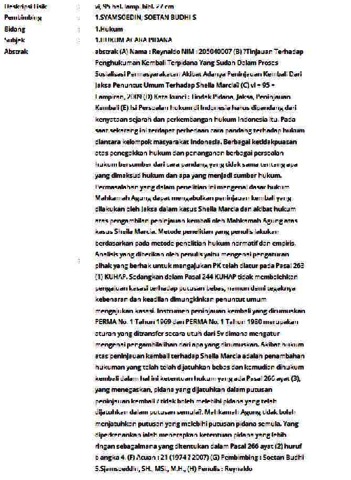 (A) Nama : Reynaldo NIM : 205040007 (B) ?Tinjauan Terhadap Penghukuman Kembali Terpidana Yang Sudah Dalam Proses Sosialisasi Permasyarakatan Akibat Adanya Peninjauan Kembali Dari Jaksa Penuntut Umum Terhadap Sheila Marcia? (C) vi + 95 + Lampiran, 2009 (D) Kata kunci : Tindak Pidana, Jaksa, Peninjauan Kembali (E) Isi Persoalan hukum di Indonesia harus dipandang dari kenyataan sejarah dan perkembangan hukum Indonesia itu. Pada saat sekarang ini terdapat perbedaan cara pandang terhadap hukum diantara kelompok masyarakat Indonesia. Berbagai ketidakpuasan atas penegakkan hukum dan penanganan berbagai persoalan hukum bersumber dari cara pandang yang tidak sama tentang apa yang dimaksud hukum dan apa yang menjadi sumber hukum. Permasalahan yang dalam penelitian ini mengenai dasar hukum Mahkamah Agung dapat mengabulkan peninjauan kembali yang dilakukan oleh Jaksa dalam kasus Sheila Marcia dan akibat hukum atas pengambilan peninjauan kembali oleh Mahkamah Agung atas kasus Sheila Marcia. Metode penelitian yang penulis lakukan berdasarkan pada metode penelitian hukum normatif dan empiris. Analisis yang diberikan oleh penulis yaitu mengenai pengaturan pihak yang berhak untuk mengajukan PK telah diatur pada Pasal 263 (1) KUHAP. Sedangkan dalam Pasal 244 KUHAP tidak membolehkan pengajuan kasasi terhadap putusan bebas, namun demi tegaknya kebenaran dan keadilan dimungkinkan penuntut umum mengajukan kasasi. Instrumen peninjauan kembali yang dirumuskan PERMA No. 1 Tahun 1969 dan PERMA No. 1 Tahun 1980 merupakan aturan yang ditransfer secara utuh dari Sv dimana mengatur mengenai pengambilalihan dari apa yang dirumuskan. Akibat hukum atas peninjauan kembali terhadap Sheila Marcia adalah penambahan hukuman yang telah telah dijatuhkan bebas dan kemudian dihukum kembali dalam hal ini ketentuan hukum yang ada Pasal 266 ayat (3), yang menegaskan, pidana yang dijatuhkan dalam putusan peninjauan kembali ? tidak boleh melebihi pidana yang telah dijatuhkan dalam putusan semula?. Mahkamah Agung tidak boleh menjatuhkan putusan yang melebihi putusan pidana semula. Yang diperkenankan ialah menerapkan ketentuan pidana yang lebih ringan sebagaimana yang ditentukan dalam Pasal 266 ayat (2) huruf b angka 4. (F) Acuan : 21 (1974 ? 2007) (G) Pembimbing : Soetan Budhi S.Sjamsoeddin, SH., MSi., M.H., (H) Penulis : Reynaldo