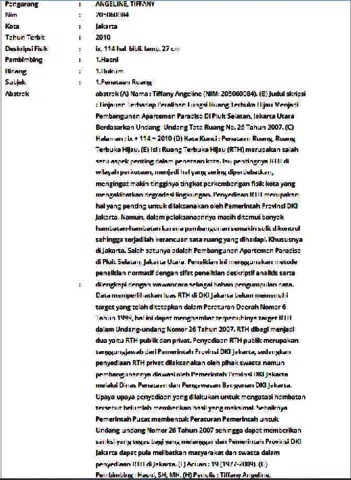 (A) Nama : Tiffany Angeline (NIM: 205060084). (B) Judul skripsi : Tinjauan Terhadap Peralihan Fungsi Ruang Terbuka Hijau Menjadi Pembangunan Apartemen Paradiso Di Pluit Selatan, Jakarta Utara Berdasarkan Undang- Undang Tata Ruang No. 26 Tahun 2007. (C) Halaman : ix + 114 + 2010 (D) Kata Kunci : Penataan Ruang, Ruang Terbuka Hijau. (E) Isi : Ruang Terbuka Hijau (RTH) merupakan salah satu aspek penting dalam penataan kota. Isu pentingnya RTH di wilayah perkotaan, menjadi hal yang sering diperdebatkan, mengingat makin tingginya tingkat perkembangan fisik kota yang mengakibatkan degradasi lingkungan. Penyediaan RTH merupakan hal yang penting untuk dilaksanakan oleh Pemerintah Provinsi DKI Jakarta. Namun, dalam pelaksanaannya masih ditemui banyak hambatan-hambatan karena pembangunan semakin sulit dikontrol sehingga terjadilah kerancuan tata ruang yang dihadapi. Khususnya di Jakarta. Salah satunya adalah Pembangunan Apartemen Paradiso di Pluit Selatan, Jakarta Utara. Penelitian ini menggunakan metode penelitian normatif dengan sifat penelitian deskriptif analitis serta dilengkapi dengan wawancara sebagai bahan pengumpulan data. Data memperlihatkan luas RTH di DKI Jakarta belum memenuhi target yang telah ditetapkan dalam Peraturan Daerah Nomor 6 Tahun 1999, hal ini dapat menghambat terpenuhinya target RTH dalam Undang-undang Nomor 26 Tahun 2007. RTH dibagi menjadi dua yaitu RTH publik dan privat. Penyediaan RTH publik merupakan tanggungjawab dari Pemerintah Provinsi DKI Jakarta, sedangkan penyediaan RTH privat dilaksanakan oleh pihak swasta namun pembangunannya diawasi oleh Pemerintah Provinsi DKI Jakarta melalui Dinas Penataan dan Pengawasan Bangunan DKI Jakarta. Upaya-upaya penyediaan yang dilakukan untuk mengatasi hambatan tersebut belumlah memberikan hasil yang maksimal. Sebaiknya Pemerintah Pusat membentuk Peraturan Pemerintah untuk Undang-undang Nomor 26 Tahun 2007 sehingga dapat memberikan sanksi yang tegas bagi yang melanggar dan Pemerintah Provinsi DKI Jakarta dapat pula melibatkan masyarakat dan swasta dalam penyediaan RTH di Jakarta. (F) Acuan : 19 (1977-2009). (G) Pembimbing : Hasni, SH, MH. (H) Penulis : Tiffany Angeline.
