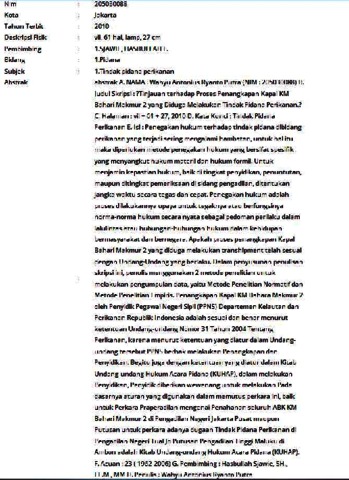 A. NAMA : Wahyu Antonius Ryanto Putra (NIM : 205030088) B. Judul Skripsi : ?Tinjauan terhadap Proses Penangkapan Kapal KM Bahari Makmur 2 yang Diduga Melakukan Tindak Pidana Perikanan.? C. Halaman : vii + 61 + 27, 2010 D. Kata Kunci : Tindak Pidana Perikanan E. Isi : Penegakan hukum terhadap tindak pidana dibidang perikanan yang terjadi sering mengalami hambatan, untuk hal itu maka diperlukan metode penegakan hukum yang bersifat spesifik yang menyangkut hukum materil dan hukum formil. Untuk menjamin kepastian hukum, baik di tingkat penyidikan, penuntutan, maupun ditingkat pemeriksaan di sidang pengadilan, ditentukan jangka waktu secara tegas dan cepat. Penegakan hukum adalah proses dilakukannya upaya untuk tegaknya atau berfungsinya norma-norma hukum secara nyata sebagai pedoman perilaku dalam lalulintas atau hubungan-hubungan hukum dalam kehidupan bermasyarakat dan bernegara. Apakah proses penangkapan Kapal Bahari Makmur 2 yang diduga melakukan transhipment telah sesuai dengan Undang-Undang yang berlaku. Dalam penyusunan penulisan skripsi ini, penulis menggunakan 2 metode penelitian untuk melakukan pengumpulan data, yaitu Metode Penelitian Normatif dan Metode Penelitian Empiris. Penangkapan Kapal KM Bahara Makmur 2 oleh Penyidik Pegawai Negeri Sipil (PPNS) Departemen Kelautan dan Perikanan Republik Indonesia adalah sesuai dan benar menurut ketentuan Undang-undang Nomor 31 Tahun 2004 Tentang Perikanan, karena menurut ketentuan yang diatur dalam Undang-undang tersebut PPNS berhak melakukan Penangkapan dan Penyidikan. Begitu juga dengan ketentuan yang diatur dalam Kitab Undang-undang Hukum Acara Pidana (KUHAP), dalam melakukan Penyidikan, Penyidik diberikan wewenang untuk melakukan Pada dasarnya aturan yang digunakan dalam memutus perkara ini, baik untuk Perkara Praperadilan mengenai Penahanan seluruh ABK KM Bahari Makmur 2 di Pengadilan Negeri Jakarta Pusat maupun Putusan untuk perkara adanya dugaan Tindak Pidana Perikanan di Pengadilan Negeri Tual Jo Putusan Pengadilan Tinggi Maluku di Ambon adalah Kitab Undang-undang Hukum Acara Pidana (KUHAP). F. Acuan : 23 ( 1962-2006) G. Pembimbing : Hasbullah Sjawie, SH., LL.M., MM H. Penulis : Wahyu Antonius Ryanto Putra