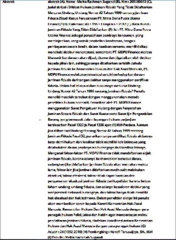 (A). Nama : Melita Rachmah Sugandi (B). Nim : 205080072 (C). Judul skripsi : ?Akibat Hukum Jaminan Fidusia Yang Tidak Didaftarkan Menurut Undang-Undang Nomor 42 Tahun 1999 tentang Jaminan Fidusia (Studi Kasus Perusahaan PT. Mitra Dana Putra Utama Finance)? (D). Halaman : viii + 155 + Lampiran + 2012 (E). Kata Kunci : Jaminan Fidusia Yang Tidak Didaftarkan (F). Isi : PT. Mitra Dana Putra Utama Finance sebagai perusahaan pembiaya konsumen, yang meminjamkan uang untuk pembelian kendaraan, dengan pembayaran secara kredit, dalam keadaan tertentu memiliki sikap manakala debitur wanprestasi, sementara PT. MDPU Finance merasa khawatir kendaraan akan dijual, disewa dan digadaikan oleh debitur kepada pihak lain, sehingga tanpa didaftarkan terlebih dahulu jaminan fidusia ke Kementrian Hukum dan Hak Asasi Manusia, PT. MDPU Finance melakukan eksekusi sendiri terhadap kendaraan jaminan fidusia dari tangan debitur tanpa menggunakan sertifikat fidusia. Dalam hal ini apa akibat hukumnya menurut Undang-Undang Nomor 42 Tahun 1999 tentang Jaminan Fidusia? Penulis meneliti masalah tersebut dengan menggunanakan metode penelitian hukum normatif. Penarikan oleh PT. MDPU Finance menggunakan Surat Pengakuan Hutang dengan Penyerahan Jaminan Secara Fidusia dan Surat Kuasa serta Surat Ijin Pengambilan Barang, yang termasuk dalam lapangan hukum perjanjian berdasarkan Pasal 1320 jo Pasal 1338 ayat (1) KUHPerdata. Namun jika dilihat dari Undang-Undang Nomor 42 Tahun 1999 tentang Jaminan Fidusia Pasal 32, penarikan tanpa sertifikat fidusia akibatnya batal demi hukum dan kreditur tidak memiliki hak istimewa yang didahulukan dalam pembayaran hutangnya dari kreditur lainnya. Mengenai faktor-faktor PT. MDPU Finance tidak mendaftarkan objek jaminan fidusia, karena adanya kekhawatiran tersebut diatas, sedangkan jika didaftarkan jaminan fidusia akan memakan waktu lama, faktor lain jika jaminan didaftarkan masih sulit melakukan eksekusi, faktor efesiensi, faktor tidak dapat bantuan dan pengamanan eksekusi jaminan fidusia dari kepolisian karena belum faham undang-undang fidusia, dan adanya kesadaran debitur yang wanprestasi melunasi hutangnya, dan faktor hanya tidak memiliki hak eksekusi dan hak istimewa. Dalam penelitian skripsi ini penulis akan memberikan saran kepada Kanwil Kementrian Hak Asasi Manusia, Kementrian Hukum Dan Hak Asasi Manusia dengan para penegak hukum Polisi, Jaksa dan Hakim agar mempercepat waktu pendaftaran jaminan fidusia, diadakan koordinasi antara Kementrian Hukum dan Hak Asasi Manusia dengan para penegak hukum (G) Acuan : 24 (1892-2010) (H) Pembingbing : Hanafi Tanuwijaya, SH., M.H (I) Penulis : Melita Rachmah Sugandi