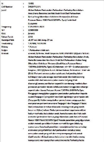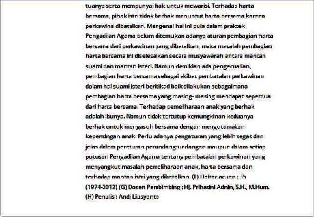 (A) Nama : Andi Liusyanto; NIM: 205050030 (B) Judul Skripsi : Akibat Hukum Pembatalan Perkawinan Terhadap Kedudukan Anak, Harta Bersama dan Hak Asuh Anak Dari Perkawinan Kedua Yang Dibatalkan Oleh Isteri Pertama (Studi Kasus Putusan Nomor 1587/Pdt.G/2010/Pa. Tgrs), (C) Halaman : vii + 97 + 3 daftar pustaka + lampiran; 2012 (D) Kata Kunci : Akibat Hukum, Perkawinan Tidak Sah (E) Isi : Perkawinan merupakan salah satu hal penting dalam kehidupan manusia sebagai makhluk sosial. Menikahi seorang wanita lebih dari satu merupakan suatu hal yang tidak disenangi,karena pernikahan seperti ini cenderung menimbulkan persoalan-persoalan dalam kehidupan rumah tangga dan keluarga seperti dalam kasus Putusan Nomor 1587/Pdt.G/2010/Pa.Tgrs. Penggugat mengajukan gugatan pembatalan perkawinan kepada suami (Tergugat I) yang telah menikah lagi dengan perempuan lain (Tergugat II). Hakim mengabulkan permohonan penggugat dan menyatakan perkawinan antara Tergugat I dan Tergugat II batal. Dari perkawinan tersebut dikaruniai seorang anak yang masih berumur 2 (dua) tahun. Timbul permasalahan bagaimana akibat hukum terhadap kedudukan anak, harta bersama dan hak asuh anak dari perkawinan kedua yang dibatalkan pada Kasus Putusan Nomor 1587/Pdt.G/2010/PA.Tgrs? Metode penelitian yang digunakan adalah metode penelitian hukum normatif dengan didukung wawancara. Data hasil penelitian menunjukkan bahwa terhadap anak-anak yang dilahirkan dari perkawinan tersebut tetap merupakan anak yang sah dan tetap mempunyai hak untuk dipelihara dan dibiayai semua kebutuhannya oleh kedua orang tuanya serta mempunyai hak untuk mewarisi. Terhadap harta bersama, pihak istri tidak berhak menuntut harta bersama karena perkawina dibatalkan. Mengenai hal ini pula dalam praktek Pengadilan Agama belum ditemukan adanya aturan pembagian harta bersama dari perkawinan yang dibatalkan, maka masalah pembagian harta bersama ini diselesaikan secara musyawarah antara mantan suami dan mantan isteri. Namun demikian ada pengecualian, pembagian harta bersama sebagai akibat pembatalan perkawinan dalam hal suami isteri beritikad baik dilakukan sebagaimana pembagian harta bersama yang masing- masing mendapat seperdua dari harta bersama. Terhadap pemeliharaan anak yang berhak adalah ibunya. Namun tidak tertutup kemungkinan keduanya berhak untuk mengasuh bersama dengan mengutamakan kepentingan anak. Perlu adanya pengaturan yang lebih tegas dan jelas dalam peraturan perundang-undangan maupun dalam setiap putusan Pengadilan Agama tentang pembatalan perkawinan yang menyangkut masalah pemeliharaan anak, harta bersama dan terhadap mantan istri yang dibatalkan. (F) Daftar acuan : 35 (1974-2012) (G) Dosen Pembimbing : Hj. Prihatini Adnin, S.H., M.Hum. (H) Penulis : Andi Liusyanto