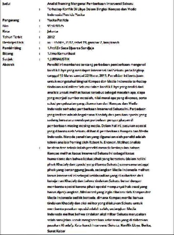 Peneliti ini membahas tentang perbedaan pemberitaan mengenai konflik Libya yang mendapat intervensi dari Sekutu pada lingkup tanggal 19 Maret sampai 22 Maret 2011. Penelitian ini bertujuan untuk mengetahui bingkai Kompas dan Media Indonesia terhadap tindakan aksi militer Sekutu dalam konflik Libya yang terdiri dari analisis untuk melihat kasus tersebut sebagai masalah apa, siapa yang menjadi sumber masalah, nilai moral apa yang dikemas, serta solusi penyelesaian yang ditawarkan dari Kompas dan Media Indonesia terhadap pemberitaan intervensi Sekutu ini. Perbedaan yang terlihat adalah bagaimana Khadafy dan pasukan oposisi yang sedang berseteru mendapat perbedaan pengungkapan di pemberitaan masing-masing media. Dalam hal ini, pasukan oposisi yang dibantu oleh Sekutu dilihat di pemberitaan Kompas dan Media Indonesia. Metode penelitian yang digunakan oleh peneliti adalah teknik analisis framing oleh Robert N. Entman. Melihat analisis berdasarkan teknik inilah peneliti menarik kesimpulan bahwa Kompas melihat kasus intervensi Sekutu ini sebagai kasus humanisme dan bahwa kedua pihak yang berseteru (dalam hal ini pihak Khadafy dan oposisi yang dibantu Sekutu) sama-sama sebagai pihak yang bertanggung jawab, sedangkan Media Indonesia melihat kasus intervensi ini sebagai ketidakadilan yang di akibatkan dari kekejaman Khadafy dan bahwa tindakan Sekutu benar dengan membantu oposisi karena pihak oposisi mempunyai hak asasi yang harus diperjuangkan. Nilai moral yang ingin dibahas oleh Kompas dan Media Indonesia sedikit berbeda, dimana Kompas menilai bahwa tindakan Khadafy dan aksi militer yang dilakukan Sekutu untuk membantu pasukan oposisi adalah salah, sedangkan Media Indonesia melihat bahwa tindakan aksi militer Sekutu merupakan salah satu jalan untuk menghentikan kekerasan yang di akibatkan pasukan Khadafy. Kata kunci: Intervensi Sekutu, Konflik Libya, Berita, Surat Kabar