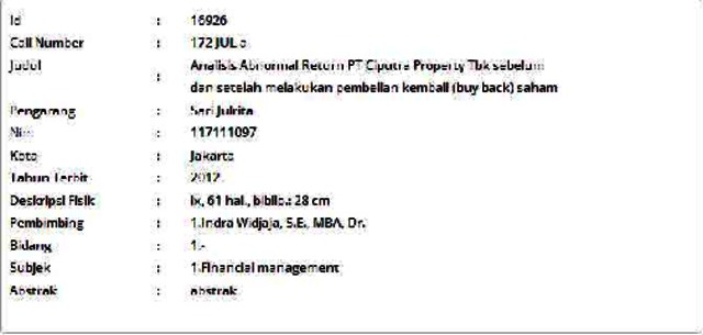 Julrita, Sari (2012) Analisis Abnormal Return PT Ciputra Property Tbk sebelum dan setelah melakukan pembelian kembali (buy back) saham. Masters thesis, Universitas Tarumanagara.