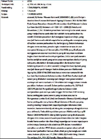 Kennardi, Wawan (2012) Analisis Atas Putusan Mahkamah Agung RI Nomor: 2838 K/Pdt/2009 Pada Kasus Kewarisan Antara Mindo Lumban Gaol Melawan Indiana Lumban Gaol. Skripsi thesis, Universitas Tarumanagara.