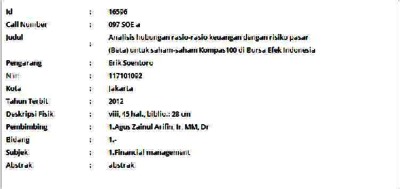 Soentoro, Erik (2012) Analisis hubungan rasio-rasio keuangan dengan risiko pasar (Beta) untuk saham-saham Kompas100 di Bursa Efek Indonesia. Masters thesis, Universitas Tarumanagara.