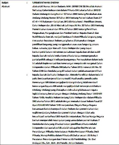 (A) Nama : Anton Sudanto NIM : 207081018 (B) ?Analisis Hukum Terhadap Calon Independen dalam Pilkada DKI Jakarta Tahun 2012 Di Dalam Undang-Undang Nomor 12 Tahun 2008 tentang Perubahan atas Undang-Undang Nomor 32 Tahun 2004 tentang Pemerintahan Daerah? (C) vi + 145 halaman + lampiran, 2012 (D) Kata kunci : Pemilihan Umum, Calon Independen, (E) Isi Abstrak Lahirnya UU No. 32 Tahun 2004 tentang Pemerintahan daerah dan PP No.6 Tahun 2005 tentang Pemilihan, Pengesahan, Pengangkatan dan Pemberhentian Kepala Daerah dan Wakil Kepala Daerah, menjadi landasan hukum Pilkada langsung yang merupakan keputusan hukum yang harus dilaksanakan dengan pemilihan langsung, yang menggunakan asas-asas langsung, umum, bebas, rahasia, jujur dan adil. Calon Independen yang dapat berkompetisi dalam rekrutmen pencalonan kepala daerah dan wakil kepala daerah melalui mekanisme pilkada tanpa mempergunakan partai politik sebagai media perjuangannya. Permasalahan dalam tesis ini adalah implementasi dan kewenangan menyeluruh mengenai Calon Independen dalam Pilkada DKI Jakarta Tahun 2012 menurut UU No. 12 Tahun 2008 dan kendala yang di hadapi dalam pelaksanaan pemilihan kepala daerah dari calon independen. Metode Penelitian dalam tesis ini yaitu berdasarkan penelitian normatif. Hasil analisa penulis yaitu Kewenangan MK dalam pengujian Undang-Undang telah memberi kewenangan kepada MK untuk menguji/judicial review produk hukum (Undang- Undang) yang ditetapkan oleh cabang kekuasaan negara legislative yang bertentangan dengan Undang Undang Dasar (UUD NRI Tahun 1945). Analisis Hukum tentang Calon Independen dalam Pilkada DKI Jakarta Tahun 2012 adalah dengan memakai dasar hukum Pasal 27 Ayat (1) UUD NRI Tahun 1945 menyatakan, ?Segala Warga Negara bersamaan kedudukannya di dalam hukum dan pemerintahan dan wajib menjunjung hukum dan pemerintahan, dengan tidak ada kecualinya?, serta Pasal 28D Ayat (3) menyatakan, ?Setiap Warga Negara berhak memperoleh kesempatan yang sama dalam pemerintahan. ? Kendala-kendala yang dihadapi dalam pemilihan pilkada melalui independen dan partai politik adalah sebagai berikut Peraturan Perundangan Pilkada, Keterbatasan Waktu Persiapan Pilkada, Desk Pilkada, Money Politics dalam Pilkada (F) Daftar acuan : 53 Buku, 4 Peraturan Perundangan dan 7 Internet (G) Pembimbing : Dr. Dwi Andayani Bs., S.H., M.H., (H) Penulis : Anton Sudanto