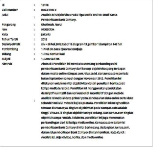 Khotimah, Nurul (2012) Analisis Isi Objektivitas Pada Tiga Media Online: Studi Kasus Pemberitaan Bank Century. Skripsi thesis, Universitas Tarumanagara.