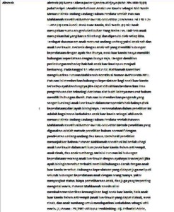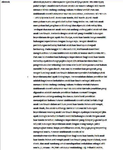 abstrak (A) Nama : Akeza Javier Tjandra Widjaya (NIM: 205080081) (B) Judul Skripsi : Analisis Kedudukan Anak Luar Kawin Sebagai Ahli Waris Menurut Kitab Undang-Undang Hukum Perdata Setelah Putusan Mahkamah Konstitusi Nomor 46/PUU-VIII/2010 (C) Halaman : vi + 92 + 29 + 2012 (D) Kata kunci : Anak Luar Kawin, Ahli Waris. (E) Isi : Anak merupakan suatu anugrah dari Tuhan Yang Maha Esa. Hak-hak anak merupakan hal yang harus dilindungi dan dipenuhi oleh setiap kita. Terdapat dua macam anak menurut undang-undang yakni anak sah dan anak luar kawin. Berbeda dengan anak sah yang memiliki hubungan keperdataan dengan ayah dan ibunya, anak luar kawin hanya memiliki hubungan keperdataan dengan ibunya saja. Dengan demikian perlindungan terhadap hak-hak anak luar kawinpun menjadi berkurang. Pada tanggal 17 Februari 2012, Mahkamah Konstitusi mengeluarkan Putusan Mahkamah Konstitusi Nomor 46/PUU-VIII/2010. Putusan ini memberikan hubungan keperdataan bagi anak luar kawin terhadap ayah kandungnya jika dapat dibuktikan berdasarkan ilmu pengetahuan dan teknologi dan/atau alat bukti lainnya menurut hukum memiliki hubungan darah. Putusan ini memberikan pengaruh yang sangat luas bagi anak luar kawin dalam memperoleh hak-haknya (hak keperdataan) dari ayah biologisnya. Permasalahan dalam penelitian ini adalah bagaimana kedudukan anak luar kawin sebagai ahli waris menurut Kitab Undang-Undang Hukum Perdata setelah Putusan Mahkamah Konstitusi Nomor 46/PUU-VIII/2010? Metode penelitian yang digunakan adalah metode penelitian hukum normatif dengan pendekatan undang-undang dan kasus. Data hasil penelitian menunjukkan bahwa Putusan Mahkamah Konstitusi ini berlaku bagi anak luar kawin dalam arti luas (anak luar kawin dalam arti sempit, anak zinah, dan anak sumbang). Melalui Putusan ini hubungan keperdataan seorang anak luar kawin dengan ayahnya bisa terjadi jika ayah biologis tersebut terbukti memiliki hubungan darah dengan anak luar kawin tersebut. Hubungan keperdataan yang didapat juga meliputi seluruh hubungan keperdataan anak dengan orang tuanya, yakni menyangkut status, biaya pemeliharaan anak, dan juga yang terpenting mengenai waris. Putusan Mahkamah Konsitusi ini membuka/memberikan kemungkinan bagi anak luar kawin, baik anak luar kawin dalam arti sempit (anak luar kawin yang dapat diakui), anak zinah, dan anak sumbang untuk mendapatkan kedudukan sebagai ahli waris. (F) Acuan : 29 (1981-2012) (G) Pembimbing : Hj. Prihatini Adnin, S.H., M. Hum. (H) Penulis : Akeza Javier Tjandra Widjaya