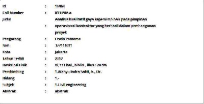Construction industry is a fast growing industry in Indonesia.It has certain business characteristic however.It also contains quite big business risk consequences if not well managed. Therefore business management in construction industry is an important factor to be considered if the goal is project success. Either poor management of a project is project leader responsibility with different styles of leadership.