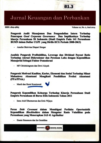 Mardi, Mardi and Kumiawati, Hemi (2014) Pengaruh motivasi kualitas, karier, ekonomi dan sosial terhadap minat mahasiswa akuntansi mengikuti pendidikan profesi akuntansi (ppa/ppak). Jurnal Keuangan dan Perbankan, 10 (2). pp. 47-63. ISSN 1829-9865