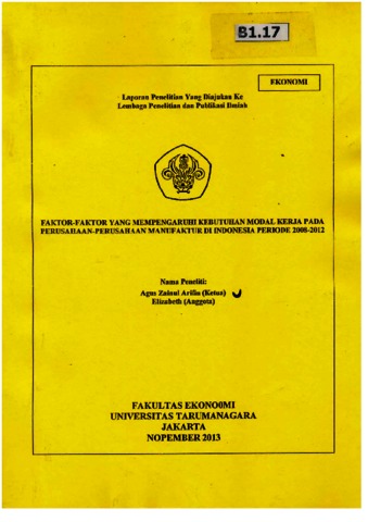 Arifin, Agus Zainul and Elizabeth, Elizabeth (2013) Faktor-faktor yang mempengaruhi kebutuhan modal kerja pada perusahaan-perusahaan manufaktur di indonesia periode 2008-2012. LPPI.