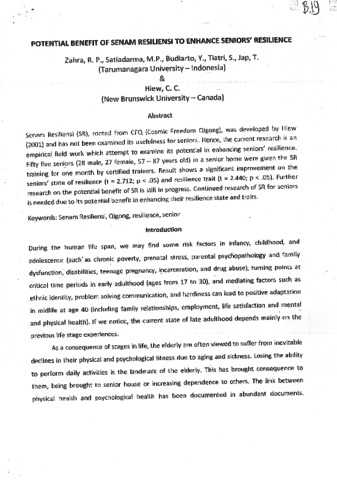 Zahra, R P and Satiadarma, Monty P and Budiarto, Yohanes and Tiatri, Sri and Jap, Tjibeng (2009) Potential Benefit of Senam Resiliency to Enhance Seniors' Resilience. In: International Federation of Aging. (Unpublished)