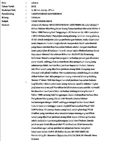 Ristiani, Nova (2012) Akibat Hukum Akta Pengakuan Utang Tanpa Jaminan Menurut UU No 4 Tahun 1996 Tentang Hak Tanggungan. Skripsi thesis, Universitas Tarumanagara.