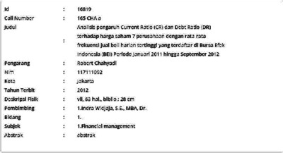 Chahyadi, Robert (2012) Analisis pengaruh Current Ratio (CR) dan Debt Ratio (DR) terhadap harga saham 7 perusahaan dengan rata-rata frekuensi jual beli harian tertinggi yang terdaftar di Bursa Efek Indonesia (BEI) Periode Januari 2011 hingga September 2012. Masters thesis, Universitas Tarumanagara.