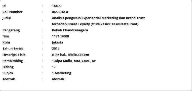 Chandranegara, Kokoh (2012) Analisis pengaruh Experiential Marketing dan Brand Trust terhadap Brand Loyalty (studi kasus: KLM Restaurant). Masters thesis, Universitas Tarumanagara.
