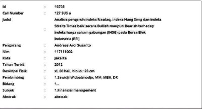 Susanto, Andreas Ardi (2012) Analisis pengaruh indeks Nasdaq, indeks Hang Seng dan indeks Straits Times baik secara Bullish maupun Bearish terhadap indeks harga saham gabungan (IHSG) pada Bursa Efek Indonesia (BEI). Masters thesis, Universitas Tarumanagara.