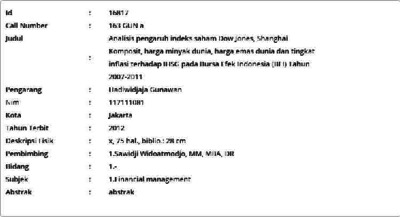 Gunawan, Hadiwidjaja (2012) Analisis pengaruh indeks saham Dow Jones, Shanghai Komposit, harga minyak dunia, harga emas dunia dan tingkat inflasi terhadap IHSG pada Bursa Efek Indonesia (BEI) Tahun 2007-2011. Masters thesis, Universitas Tarumanagara.