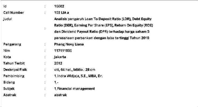 Novy Liana, Phang (2012) Analisis pengaruh Loan To Deposit Ratio (LDR), Debt Equity Ratio (DER), Earning Per Share (EPS), Return On Equity (ROE) dan Dividend Payout Ratio (DPR) terhadap harga saham 5 perusahaan perbankan dengan laba tertinggi Tahun 2010. Masters thesis, Universitas Tarumanagara.