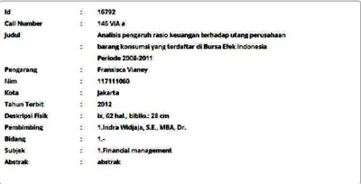 Vianey, Fransisca (2012) Analisis pengaruh rasio keuangan terhadap utang perusahaan barang konsumsi yang terdaftar di Bursa Efek Indonesia Periode 2008-2011. Masters thesis, Universitas Tarumanagara.