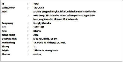 Chandra, Frengky (2012) Analisis pengaruh tingkat inflasi, nilai tukar rupiah/dollar dan suku bunga SBI terhadap return saham pertambangan batu bara yang terdaftar di Bursa Efek Indonesia. Masters thesis, Universitas Tarumanagara.