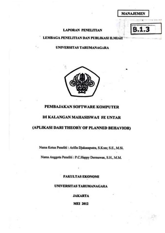 Djakasaputra, Arifin and Dermawan, P.C. Happy (2012) Pembajakan software komputer di kalangan mahasiswa/i fe untar (aplikasi dari theory of planned behavior). Laporan Penelitian dan Publikasi Ilmiah Universitas Tarumanagara.