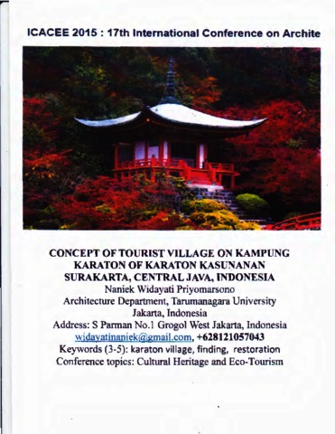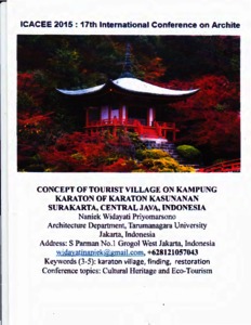 Priyomarsono, Naniek Widayati (2015) CONCEPT OF TOURIST VILLAGE ON KAMPUNG KARATON OF KARATON KASUNANAN SURAKARTA, CENTRAL JAVA, INDONESIA. ICSAUD KYOTO-INTERNATIOANAL CONFERENCE ON SUSTAINABLE ARCHITECTURE.