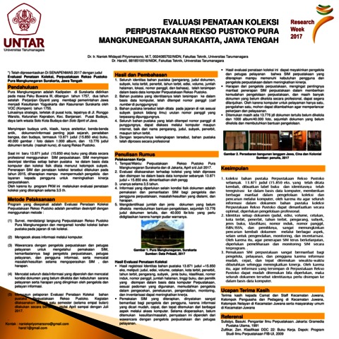 Priyomarsono, Naniek Widayati and Harsiti, Harsiti (2017) EVALUASI PENATAAN KOLEKSI PERPUSTAKAAN REKSO PUSTOKO PURA MANGKUNEGARAN SURAKARTA, JAWA TENGAH. In: SENAPENMAS 2017, 2017, Universitas Tarumanagara.