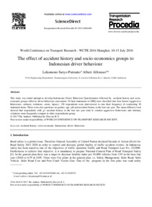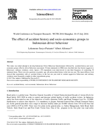Putranto, Leksmono Suryo and Alfonsus, Albert (2016) The effect of accident history and socio-economics groups to Indonesian driver behaviour. In: World Conference on Transport Research, 10-15 July 2016, Shanghai.