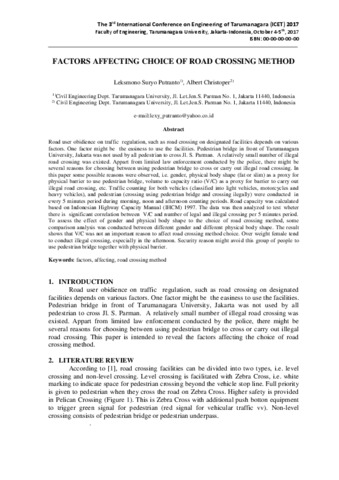 Putranto, Leksmono Suryo and Christoper, Albert (2017) FACTORS AFFECTING CHOICE OF ROAD CROSSING METHOD. In: The 3rd International Conference on Engineering of Tarumanagara (ICET) 2017.