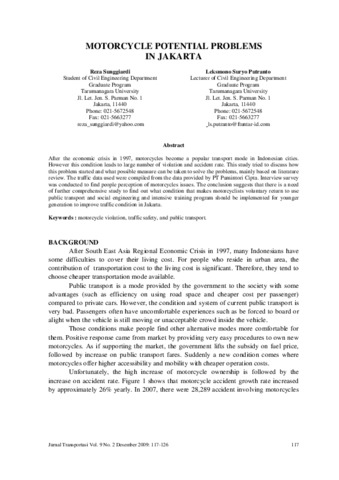 Putranto, Leksmono Suryo and Sunggiardi, Reza (2009) MOTORCYCLE POTENTIAL PROBLEMS IN JAKARTA. Jurnal Forum Studi Transportasi antar Perguruan Tinggi, IX (2). pp. 117-125. ISSN 1411-2422