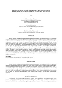 the purpose of maintaining appropriate infrastructure for the freight transport itself in terms of suitable road geometry, road pavement structure and road environment. Secondly, it is required for the purpose of maintaining general traffic in an acceptable level of service. Thirdly, it is required to protect road site activities and environment from any potential hazard generating from freight transport. In order to determine freight transport route network in an area, there are several factors that should be considered, e.g. freight transport demand, land use master plan, sustainability of the environment, etc. This paper will discuss the determination of freight transport route network in Bali and West Nusa Tenggara,
