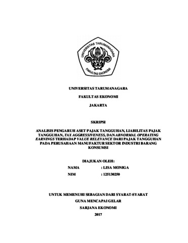 Moniga, Lisa (2017) Analisis pengaruh aset pajak tangguhan, liabilitas pajak tangguhan, tax aggressiveness, dan abnormal operating earnings terhadap value relevance dari pajak tangguhan pada perusahaan manufaktur sektor industri barang konsumsi/Lisa Moniga. Skripsi thesis, Universitas Tarumanagara.