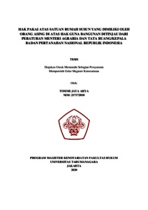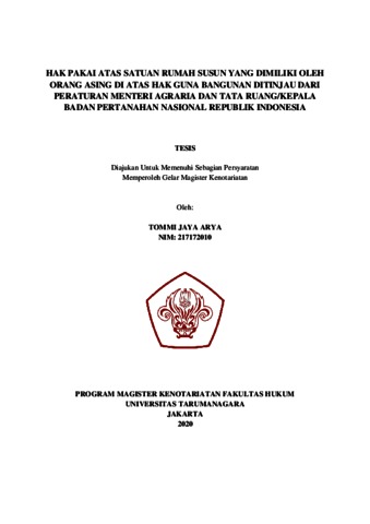 Arya, Tommi Jaya (2020) Hak Pakai Atas Satuan Rumah Susun Yang Dimiliki Oleh Orang Asing Di Atas Hak Guna Bangunan Ditinjau Dari Peraturan Menteri Agraria Dan Tata Ruang/Kepala Badan Pertanahan Nasional Republik Indonesia. Masters thesis, Universitas Tarumanagara.