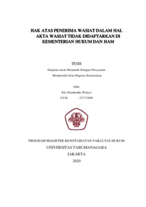 Waluyo, Eric Priambodho (2020) Hak atas Penerima Wasiat dalam hal Akta Wasiat tidak Didaftarkan di Kementerian Hukum dan Ham. Masters thesis, Universitas Tarumanagara.