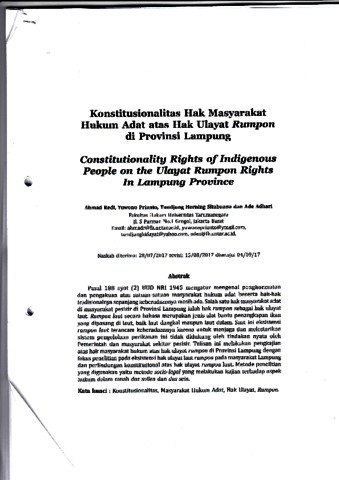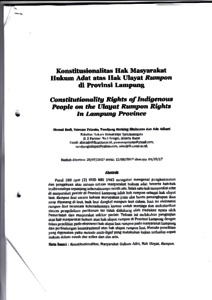 Redi, Ahmad Konstitusionalitas Hak Masyarakat Hukum Adat atas Hak Ulayat li:urntrton di Provinsi Lampung. Konstitusionalitas, Masyarakat Hukum Adat, Hak Ulayat, Rumpon..