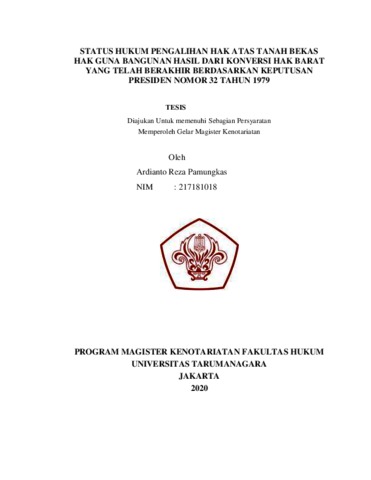 Pamungkas, Ardianto Reza (2020) Status hukum pengalihan hak atas tanah bekas hak guna bangunan hasil dari konversi hak barat yang telah berakhir berdasarkan keputusan presiden nomor 32 tahun 1979. Masters thesis, Universitas Tarumanagara.