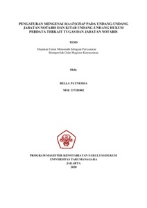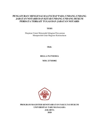 Patnessia, Bella (2020) Pengaturan Mengenai Maatschap pada Undang-Undang Jabatan Notaris dan Kitab Undang-Undang Hukum Perdata Terkait Tugas dan Jabatan Notaris. Masters thesis, Universitas Tarumanagara.