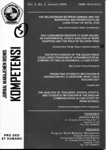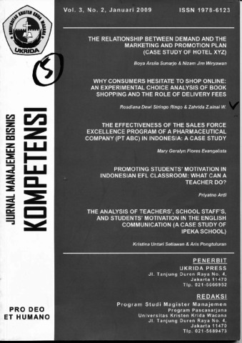 This study was conducted to find out if and how delivery charge and three other situational factors affect consumers' book shopping channel choice. A survey was conducted among a convenience sample of 200 book shoppers in all over Jakarta. Each respondent was presented with two hypothetical book shopping scenarios characterised by four situational factors. Respondents were asked to indicate their preference for shopping online or in-store in each described situation. They also provided information about their last grocery shopping trip Data were then analyzed using frequency, multiple regresion, and principal component analysis. The results show that all four situational factors affect consumers' shopping channel preference. lt was further established that, though of influence, delivery charges are not the most important factor. Fifteen minutes difference in travel time to the grocery store had a greater impact on therelative preference to shop online or in-store than a delivery fee of 20,000 lDR.