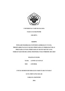 Gunawan, Aswin (2017) Pengaruh kebijakan dividen, kebijakan utang, profitabilitas, dan ukuran perusahaan terhadap nilai perusahaan pada perusahaan manufaktur yang terdaftar Bursa Efek Indonesia periode 2013-2015 / Aswin Gunawan. Skripsi thesis, Universitas Tarumanagara.
