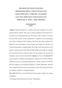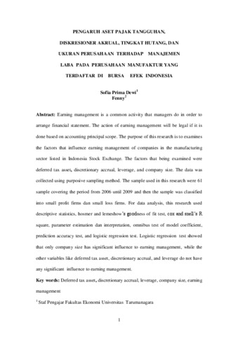 Dewi, Sofia Prima and Fenny, Fenny (2011) PENGARUH ASET PAJAK TANGGUHAN, DISKRESIONER AKRUAL, TINGKAT HUTANG, DAN UKURAN PERUSAHAAN TERHADAP MANAJEMEN LABA PADA PERUSAHAAN MANUFAKTUR YANG TERDAFTAR DI BURSA EFEK INDONESIA. Karya Ilmiah Dosen.